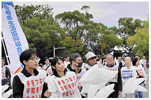 長崎県生協連から、ララコープ3名、グリーンコープ2名、長崎県学校生協1名、市役所生協 1名、いきいきコープ1名、こくみん共済コープ1名、県連2名の計11名が参加し、爆心地公園までを元気に行進しました。